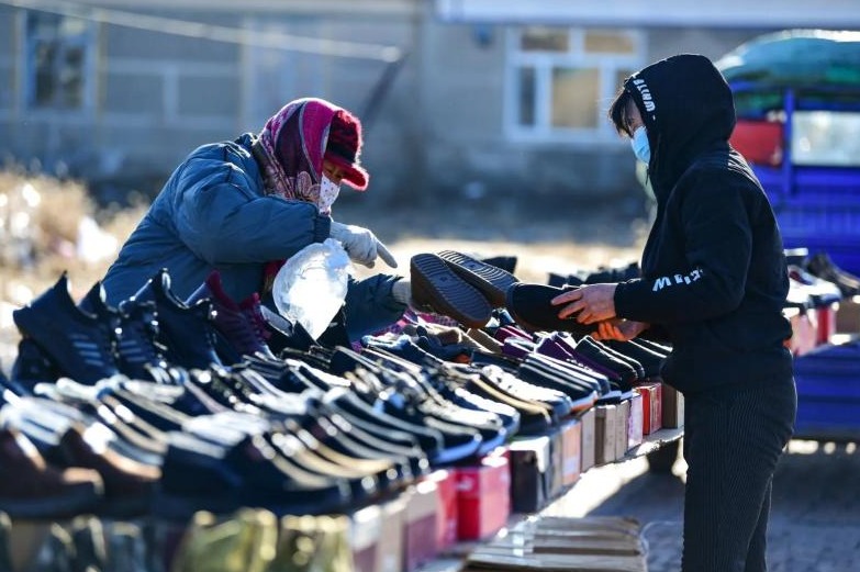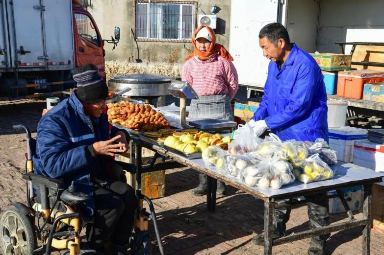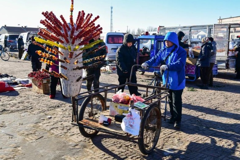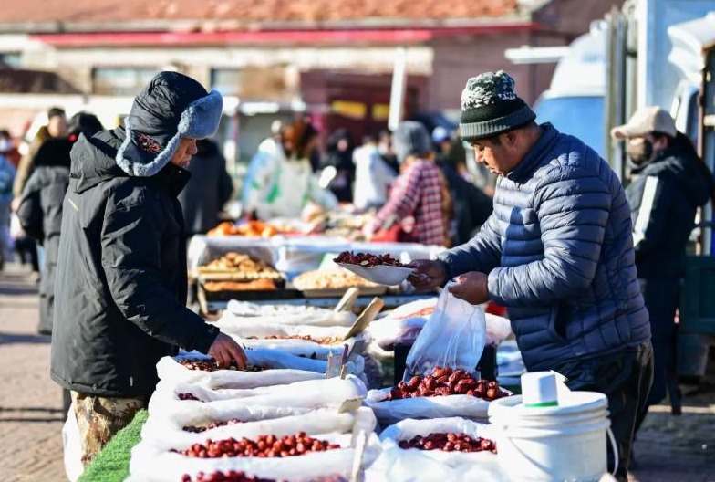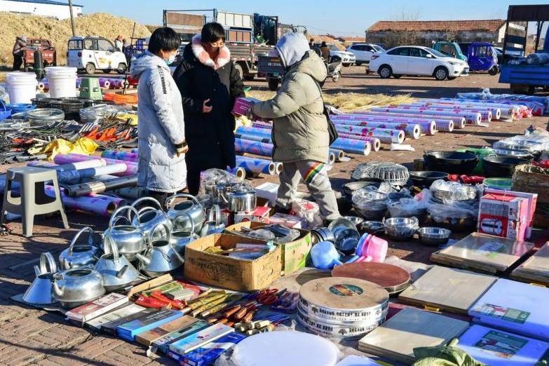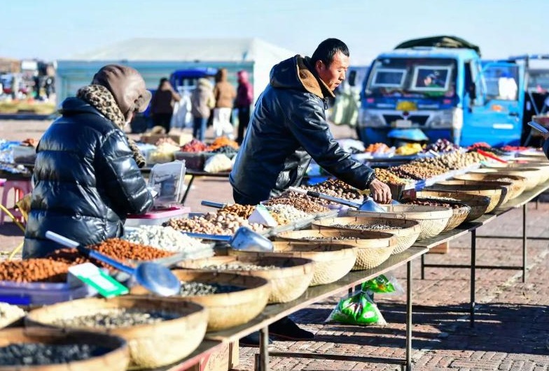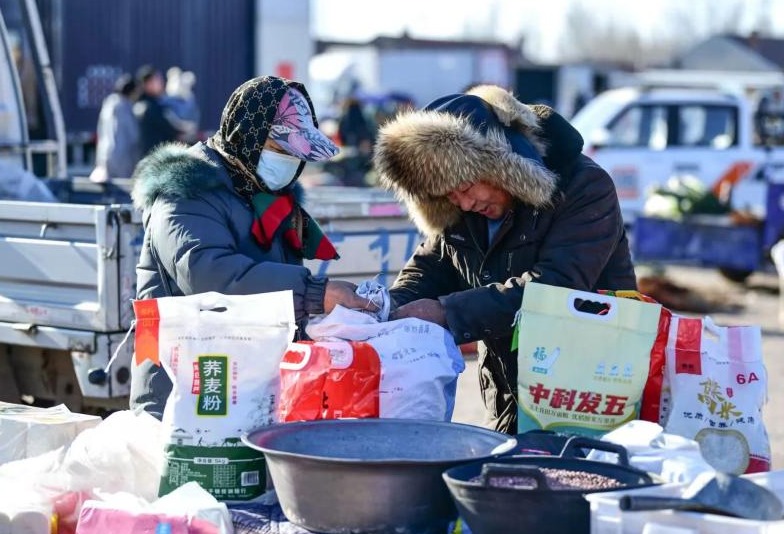 肉香果香裹滿煙火氣。冬日鋪展的科爾沁區(qū)錢家店鎮(zhèn)大集,早己被叫賣聲浸得暖熱。鮮果攤前橙黃的橘子堆成小山,干果攤上的花生、葡萄干、大杏仁等焦香漫開,農(nóng)副產(chǎn)品區(qū),農(nóng)戶筐里的蘿卜干、大蔥、地瓜等正迎接著顧客的選購,鞋帽攤上顧客拿著一雙鞋與攤主討價(jià)還價(jià),百貨攤上的暖壺、棉手套、針線擺放齊整……從自家腌漬的醬菜到剛卸車的水果,百元就能拎回半袋的鄉(xiāng)味。風(fēng)裹著果香肉香糧香,把鄉(xiāng)野的熱鬧揉成了最暖的冬日煙火。(張啟民)